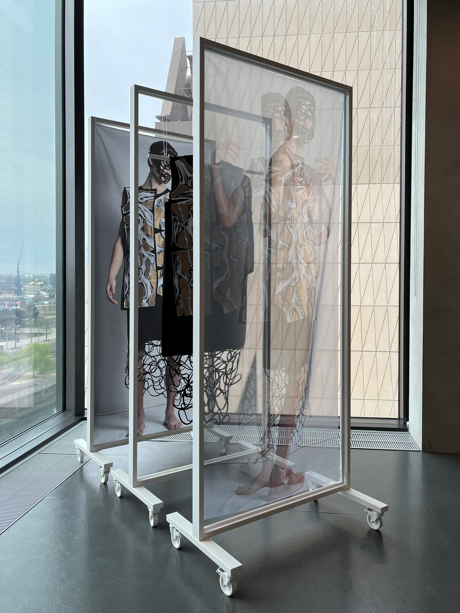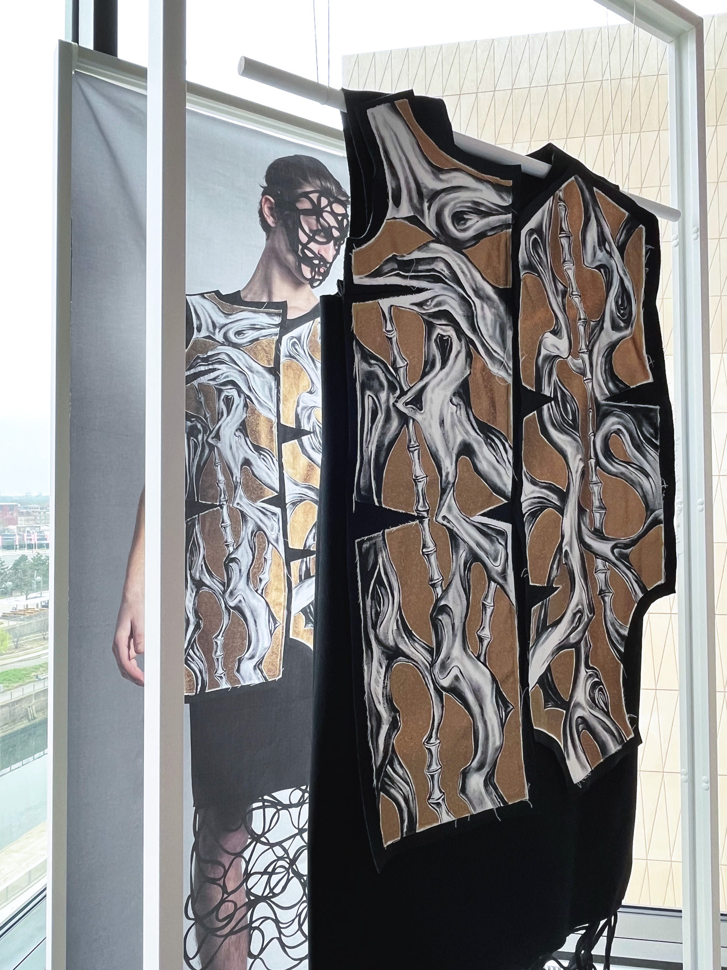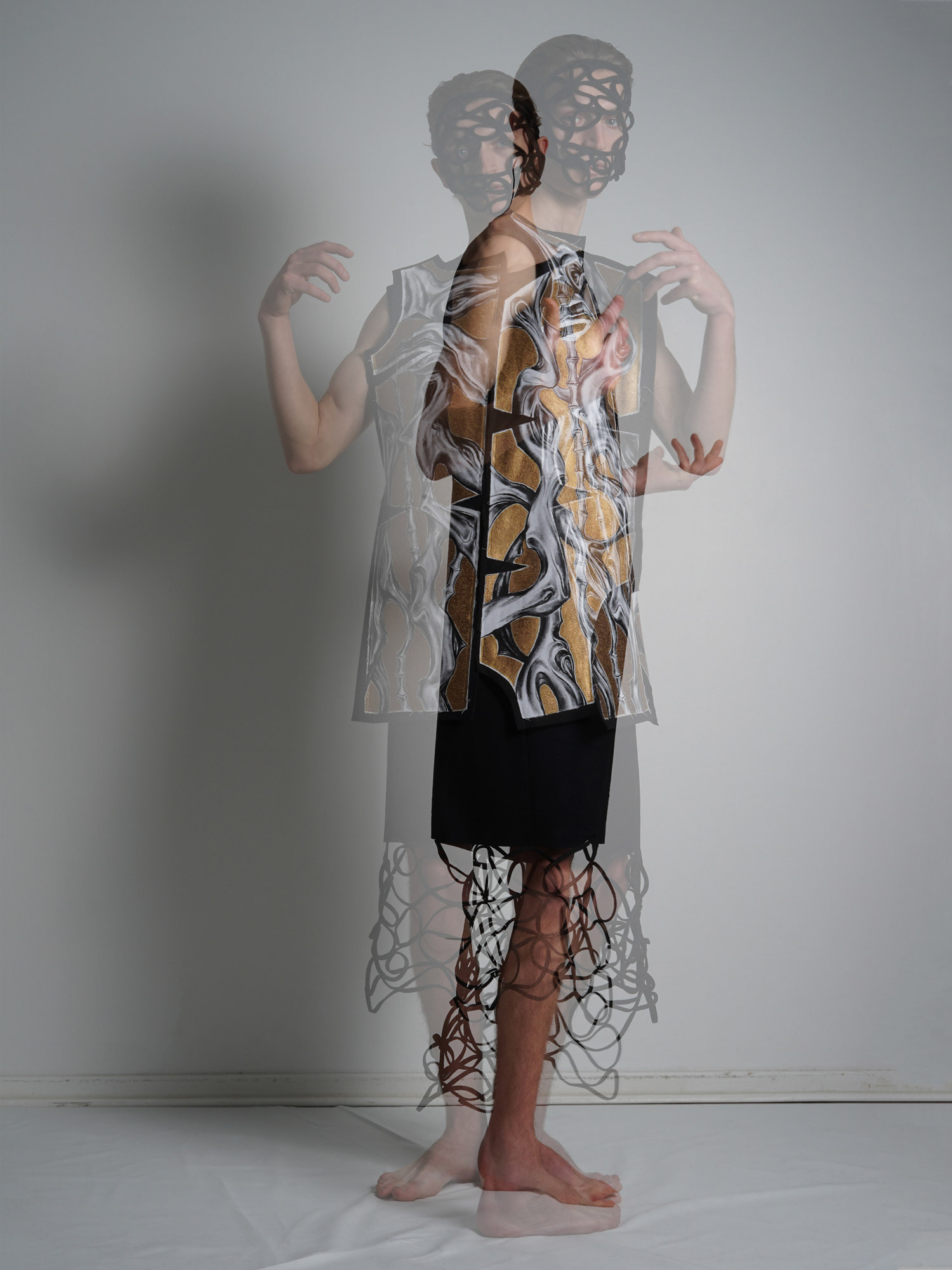 Corporeal Flux is a practice-based research project that explores the refugee experience and healing through collaborative creative practice. The installation includes wearable art by Zoran Dobric and suspended photographic prints of the piece by Stephen Severn. The garment is informed by Dobric’s refugee experience when he fled the war in the former Yugoslavia. Dobric expresses these disturbing memories through hand-painted abstracted morphing bodies that represent physical and cultural displacement. The photographs by Severn present these memories and experiences as a fluid search for self- realization through community.
