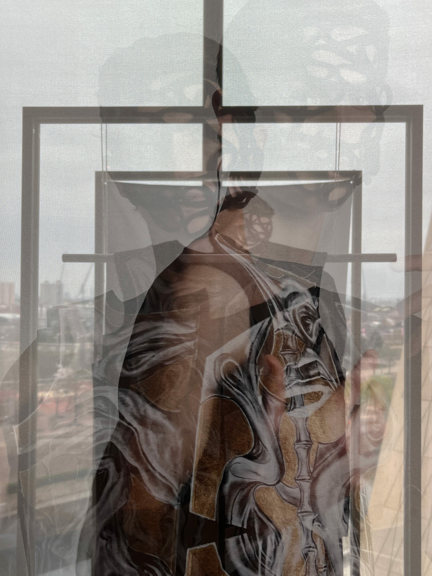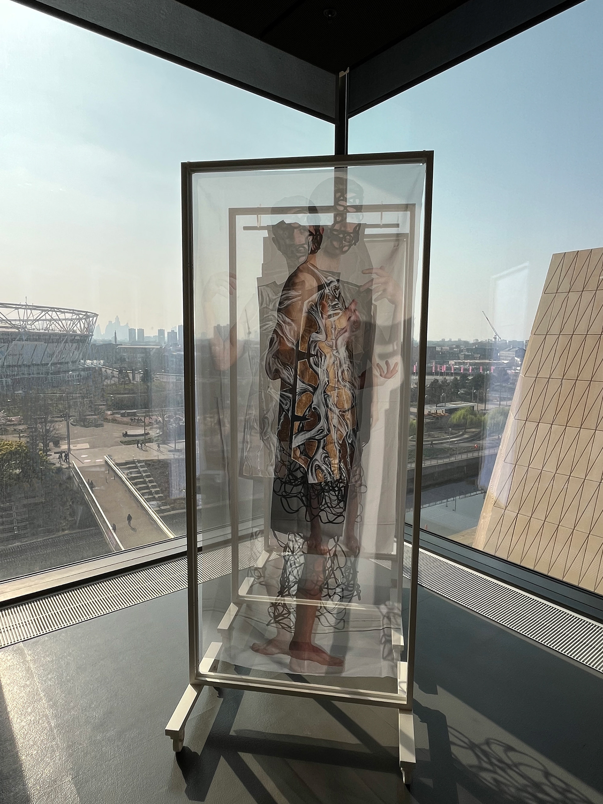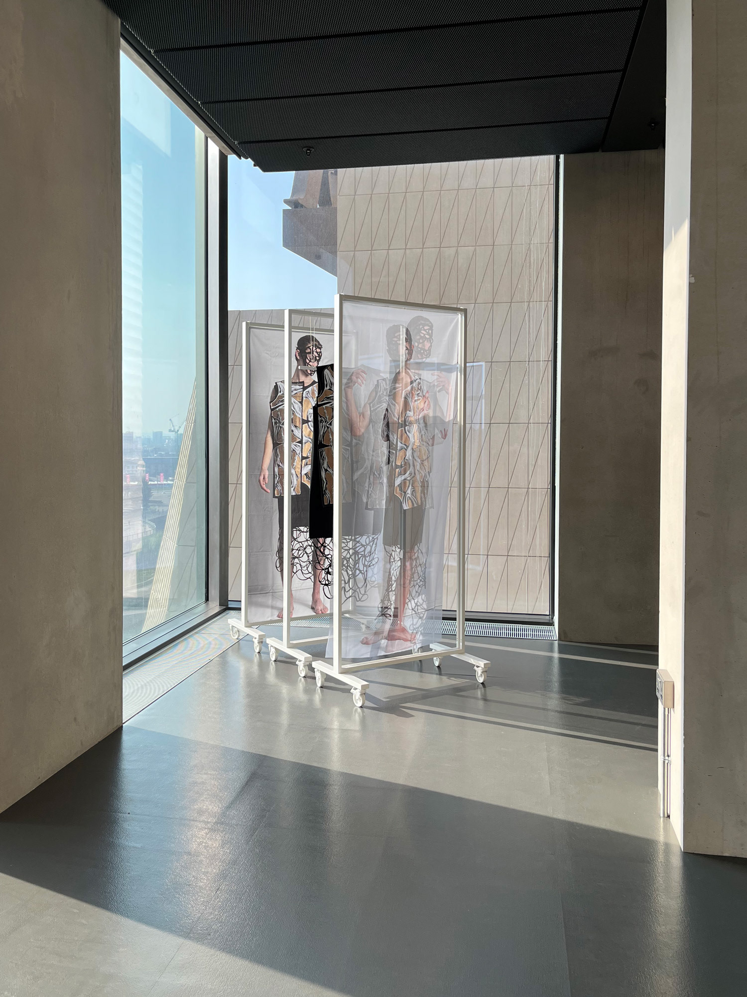 Corporeal Flux is a practice-based research project that explores the refugee experience and healing through collaborative creative practice. The installation includes wearable art by Zoran Dobric and suspended photographic prints of the piece by Stephen Severn. The garment is informed by Dobric’s refugee experience when he fled the war in the former Yugoslavia. Dobric expresses these disturbing memories through hand-painted abstracted morphing bodies that represent physical and cultural displacement. The photographs by Severn present these memories and experiences as a fluid search for self- realization through community.