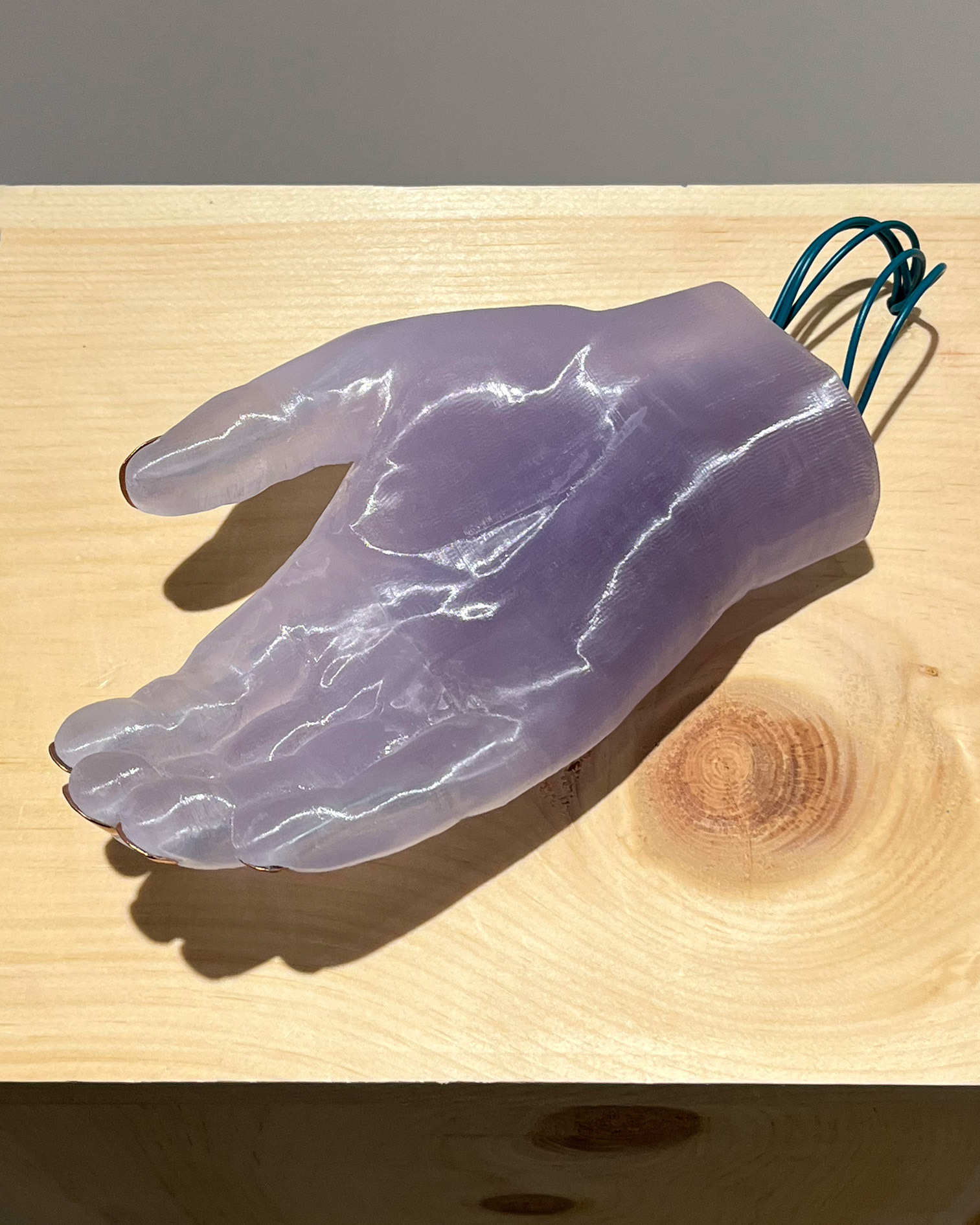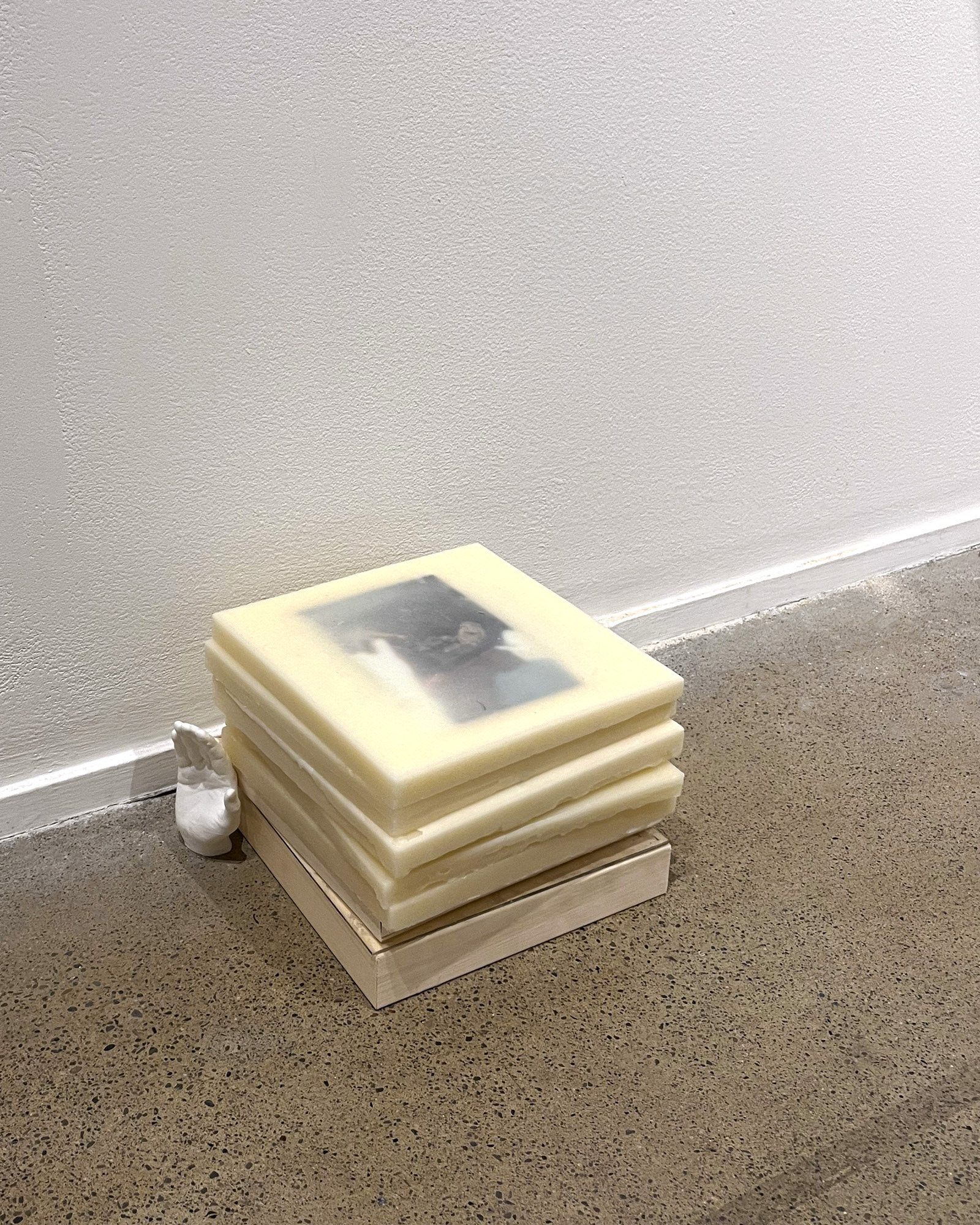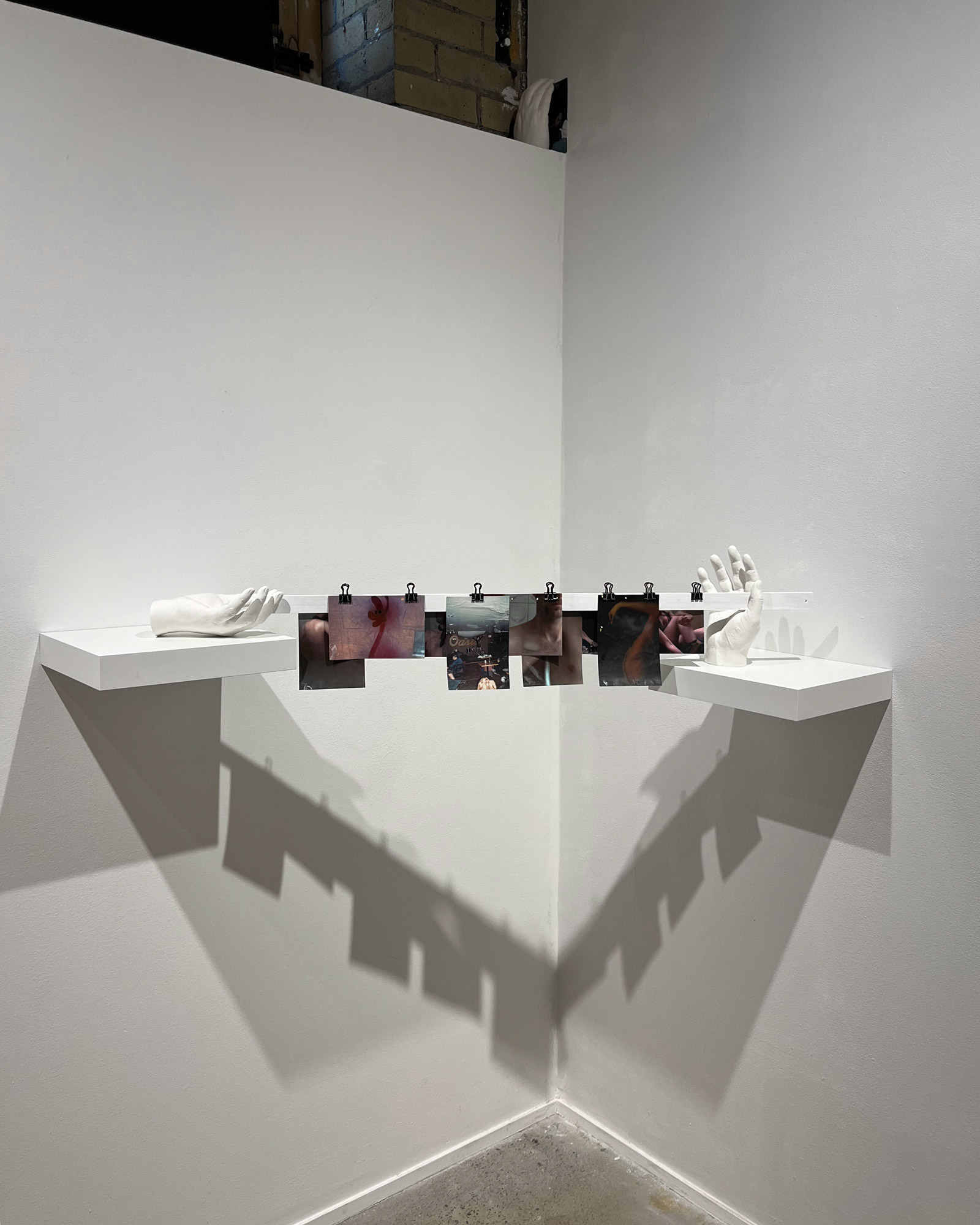 Feed-Back includes a 3D-printed hand with copper fingernails that activate sound when touched, and snapshots spanning twenty years that are dipped in beeswax and arranged achronologically. Through these works, I externalize the interior ephemeral things we carry as personal archives—fleeting memories, unheard sounds, and unseen images—exploring how identity becomes unfixed and rerouted through constantly shifting relationality.